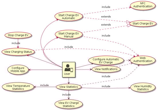 As an integral part of the project and to allow the EV owner to interact with the platform, a mobile app was developed in C# using the framework Xamarin.Forms, which allows multiplatform development for Android, iOS and UWP (Universal Windows Platform). Figure 5 presents the use case diagram that enumerates the most relevant features implemented.