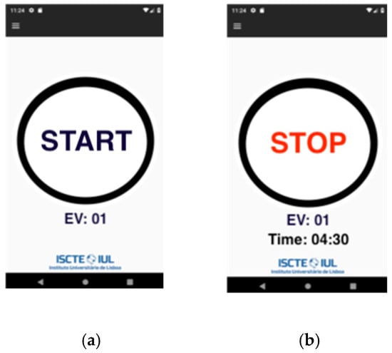 Mobile app interfaces for starting the EV charging (a) process and for stopping the EV charging process (b).