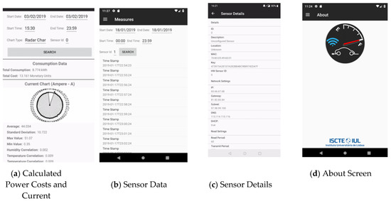 Initiating the EV charging process is the key function of the mobile app, being simultaneously the most frequent operation, as charging the EV is the purpose of the entire system. Requiring the EV owner to connect to a network where the management unit is reachable, as is illustrated in Figure 3 (assuming that the system operates in a closed network), to be able to start the charging process adds a non-practical, time-consuming process. Aiming to improve the user experience, while performing the operation, we have implemented two approaches: one automatic approach supported by the NFC capabilities of the user’s mobile device and one manual approach relying exclusively on the implemented mobile app. Using a more automatic approach, the user initiates the charging process using the NFC capabilities of his mobile device to authenticate the operation, starting the process by placing his mobile device near to the NFC reader attached to the IoT unit. In this case, the process will use the statistical information collected from the previous operations to confirm the user authentication, estimate the power needs and the amount of time that the EV will be connected to the charging plug (to forecast the power/time usage). Complementary to this process, a more controlled approach can be used, when the NFC device is not available or not attached to the sensor unit, or if the vehicle owner needs to configure the charging process (setting parameters such as the amount of the battery energy according to the state of charge (SoC), the amount of time connected to the platform, time-window for charging, etc.). In this case, the charging process can be initiated by connecting to the network where the management unit is reachable, eventually to the Wi-Fi network provided by the management unit, and manually starting the process, providing the required information. Figure 6 shows the application interfaces to initiate a charging process and to stop the charging process.