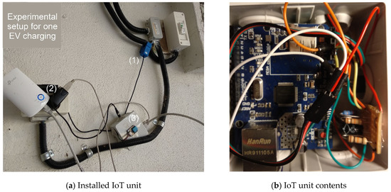 Developed prototype: (a) IoT unit prototype deployed in one test environment to take measurements at a condominium; (b) contents of the IoT unit prototype.