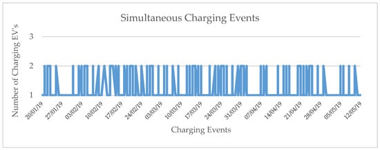 Figure 20 displays simultaneous charging events for the entire period analysed (330 charging events on 20 January and 12 May). Due to the power limitations, only two EVs are allowed to be charging at the same time, using full charging power, and the power is delivered on a first-come, first-served (FCFS) basis, where the platform controls the maximum number of stations that are allowed to charge the EVs simultaneously, queueing the remaining charging requests until a charging slot is available.