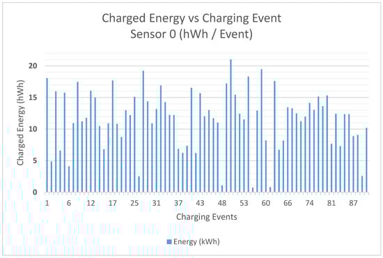 Figure 21 shows the charging sessions of a Leaf with 24 kWh battery capacity, in a 3.5 month period, where it is possible to verify charging session periods ranging from 1 to 9 h (with an arithmetic average of 5.12 h and standard deviation of 2.03 h), and Figure 22 shows the charged energy, which varies between 2 kWh and 22 kWh (with an arithmetic average of 11.67 kWh and standard deviation of 4.58 kWh). It is possible to identify in this figure that, on average, this driver only charges 52% of the total charge and uses, on average, 5.5 h to charge the EV. From this approach, it is possible to identify driver profiles and use this for future charging processes accounting for the power limitation, as is shown in [,].
