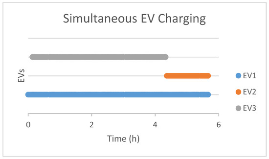 Figure 23 shows the charging process with three EVs at the condominium, where it is possible to identify that, due to the power limitation, EV2 had to wait for an available charging window.