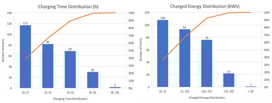 Figure 24 presents the distributions for the charging time (left) and for the charged energy (right) for each charging event. It can be observed that for 89% of the charging events ((117 + 82 + 69)/300), the EV will be charging for 6 h or less. A similar analysis can be made for the charging energy, where for 92% ((108 + 93 + 76)/300) of the charging events, the EV will charge 15 kWh, which represents roughly 62.5% of the total battery capacity.