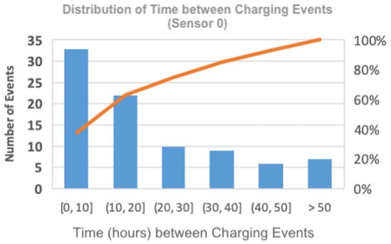 Several usages pattern also were observed. Figure 25 displays the distribution of the amount of time between each EV charging event, which shows that for 64% of the times the driver charges the EV with less than 20 h between charging events, which may be correlated with the commute journey.