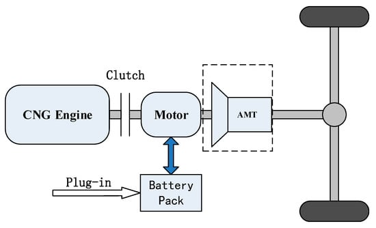 Plug-in hybrid electric bus (PHEB) powertrain includes: natural gas engine, clutch, electric motor and automatic mechanical transmission (AMT), as shown in Figure 1. The engine and the motor are coaxially connected by a clutch, which can drive the vehicle separately or together. There are five operating modes for the powertrain: pure electric mode, engine driving mode, hybrid driving mode, driving charging mode, and braking energy recovery mode. These modes switches between each other to meat different power requirements in actual operation. The parameters of the PHEB are shown in Table 1.