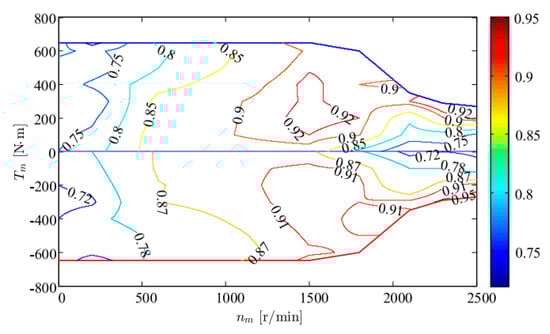 The permanent magnet synchronous motor (PMSM) is chosen in this paper. The PMSM model is also established according to the efficiency characteristic data obtained from the experiment. The torque of the electric motor is directly obtained through the motor efficiency map in Figure 3.