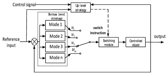 Each mode can be considered as a state of the vehicle, and the switching between these states can be seen as a series of discrete events. In each specific mode, the dynamic subsystem of the vehicle can be regarded as a relatively independent continuous variable dynamic system. The control of such hybrid systems can be solved by the bumpless mode switching control shown in Figure 4. In Figure 4, the upper level strategy acts as the system switch and sends out mode switching orders at a certain time according to the control signals (driver’s instructions, speed, power component status, etc.). Different switches correspond to different modes, and each mode is controlled by the bottom level strategy.