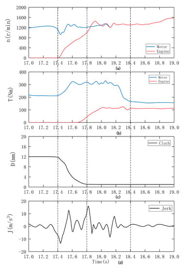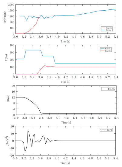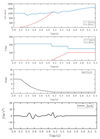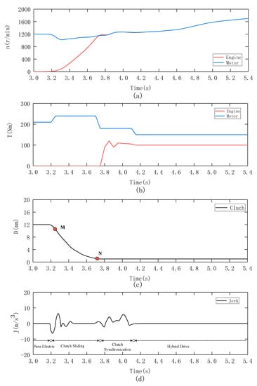 The simulation results are shown in Figure 7. In Figure 7c, the ordinate value D refers to the clutch displacement. It can be seen that the mode transition starts from 3.2 s and ends at 4.15 s with a duration of 0.95 s. The impact mainly occurs in three stages: clutch engagement stage, the engine start stage and engine dynamic coupling stage. Among them, the biggest impact occurs in the clutch initial engagement stage, and the maximum amplitude of the vehicle jerk intensity is 6.96 m/s3 at 3.28 s, when the engine speed and torque are both zero, and the maximum torque of the motor is 240 Nm. The three stages are specifically analyzed as follows: