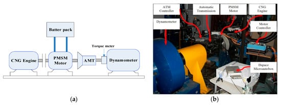 In order to verify the control strategy proposed in this paper, a test bench for a coaxial hybrid power system is established. The layout of the test bench is shown in Figure 10a and the bench is shown in Figure 10b. Its main components are: A natural gas engine, a PMSM motor, a clutch and a five speed gearbox, and also there is a dynamometer to generate a resistive torque, to act as a load in order to imitate real vehicle running in a road. The natural gas engine, clutch, electric motor, AMT and dynamometer are connected coaxially, and the battery pack drives the motor through the motor controller.