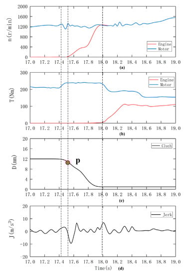In the clutch engagement stage, the clutch is combined from 17.45 s and synchronized to 17.92 s. The point P in Figure 12c is the half-joint point, where the clutch friction torque is equal to the engine resistance torque. After that, the engine speed accelerates from 0 to the set starting speed 1200 r/min (Figure 12a). The maximum amplitude of the jerk is −8.9 m/s3 in this stage. In the engine start stage, the start time is from 17.9 s to 18.3 s. When the engine speed reaches 1200 r/min, it starts to ignite. The ripple torque generated during engine ignition causes impact on driveline. The maximum amplitude of the jerk is 5.6m/s3 in this stage, which is smaller than the clutch engagement stage. In the engine dynamic coupling stage, the maximum amplitude of the jerk is 3.8 m/s3, which is the smallest among the three stages. The time of this stage begins at 18.3 s and ends at 18.64 s.