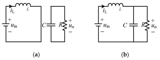 Figure 1a,b corresponds to the circuit states of the boost converter in the switching-on state and switching-off state of a switching tube VT, respectively. The corresponding Equations (1) and (2) of