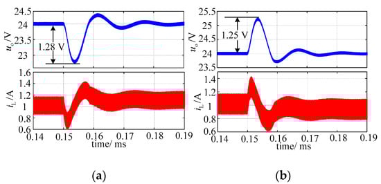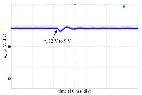 Figure 15 illustrates the experimental response of the input voltage step decreasing from 12 V to 9 V. In contrast,