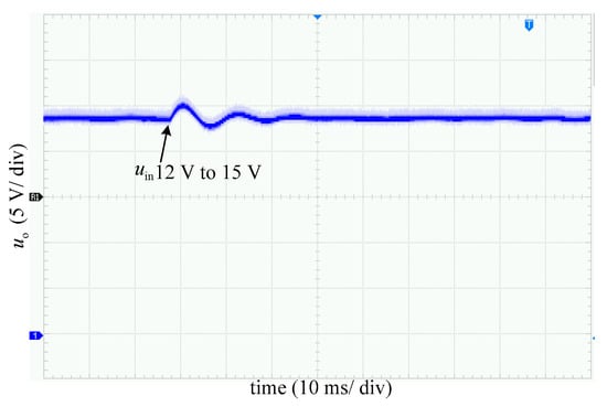 Figure 16 illustrates the response of the input voltage, increasing from 12 V to 15 V. The experimental results are in good agreement with the simulation results shown in