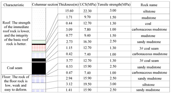 The Dananhu No. 1 Coal Mine is located in Hami City, Xinjiang, China. The location map for the Dananhu No.1 Coal Mine is presented in Figure 1. At present, the #3 coal seam is mined, and the coal seam dip angle is 3–13°. The thickness of the coal seam varies greatly, mostly within the range of 5.2–9.5 m, and the average thickness is 5.8 m. The buried depth is approximately 260 m. The panel is caving coal mining, and the mining roadways on both sides are arranged along the coal floor. The #3 coal seam floor of the mine’s panel 1306 area is mainly composed of carbonaceous mudstone, sandy mudstone, and siltstone. Up to approximately 4.0 m, the rock is argillaceous rock with weak strength and sensitivity to the influence of mining. The immediate roof of the #3 coal seam mainly consists of mudstone rock with lower strength. The main roof mainly consists of siltstone with a thickness of more than 15.0 m, and a small part of sandy mudstone. The main roof has better integrity. The roof, coal seam and floor strata structure peephole results for the coal seam of the panel 1306 return airway roadway are presented in Figure 2.