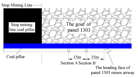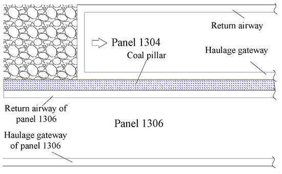 The replacement method for the panel consists of reserving coal pillars to protect the roadway. The presence of an aquifer above the roof of the coal seam results in a large amount of water in the adjacent goaf, and the mine uses thick coal mining. Under such production and geological conditions, it is easy to have the water in the goaf pouring into the coal face. When the coal pillar size is less than 10 m. At the same time, the mine tried to set up coal pillars with a width of 30–35 m, but the phenomenon of floor heave is still significant, due to the soft floor of the roadway and sensitivity to the influence of mining. Considering the severe rich water conditions in the goaf and the rate of resource mining, the coal pillar size was determined as 20 m. To alleviate the intense relationships between mining and tunneling, before panel 1304 was mined, panel 1306’s return airway in the mining roadway had been arranged. This subjected the mining roadway to a drastic mining effect during panel 1304’s mining process. The surrounding rock deformation was severely damaged under the influence of the front abutment pressure and side abutment pressure, which were exerted by the rock surrounding the roadway during the mining process. The mining roadway layout of panels 1304 and 1306 is shown in Figure 3.