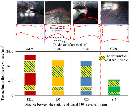 The coal seam thickness is monitored at intervals of 80–100 m in the field. According to the measurement of surface displacement, the asymmetric floor heave phenomenon of the coal pillar roadway is directly related to the coal thickness of the upper section panel, as shown in Figure 4. The setup entry is driven at the starting line of a longwall panel and used to set up equipment, from which mining activities begin. Within a certain range of top coal thickness, the maximum deformation position of the floor gradually moves toward the middle position of the roadway as the thickness of the top coal increases. For example, when the top coal thickness of the upper section panel was 3.8 m, the maximum deformation position of the floor was on the side of the coal pillar. When the top coal thickness increased to 4.7 m, the maximum deformation position of the floor was biased toward the middle. When the thickness of the top coal increased to a certain extent, the maximum deformation position of the floor was still biased toward the middle in most areas. The deformation of the surrounding rock was obviously moderated in the small part of the area. As shown in Figure 4, the thickness of the top coal was 6.3 m and 6.7 m.