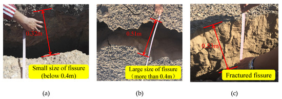 The surface connected fissure formed by the goaf of the upper section panel was observed to clarify the main roof strata rotation state of the upper section panel, and the stress characteristics of the rock surrounding the mining roadway. Figure 5 shows the side surface connected fissure of panel 1304. As can be seen, the fissure size is different, which means that the breaking deflection angle of the main roof strata is also different. The existence of the cutting fissure indicates that the breaking of the main roof strata also appeared as cut off. Moreover, a certain relationship exists between the shape of the surface-connected fissure and the top coal thickness of the upper section panel. When the thickness of the top coal is small, the size of the fissure is also small, as shown in Figure 5a. When the thickness of the top coal is large, the size of the fissure is larger. In addition, the fractured fissure may also be cut off, as shown in Figure 5b,c.