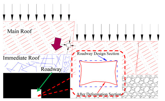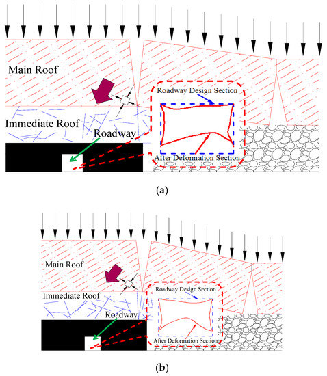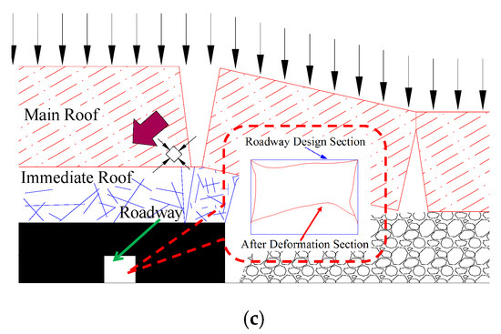 According to the observation and thickness statistics of the top coal during the mining process of the upper section panel, the roof overburden in the area above the mining roadway can be approximately divided into three types: smaller thickness of top coal (below 2 m), medium thickness of top coal (2–5 m), and larger thickness of top coal (more than 5 m). The mining roadway is in the side abutment pressure influence zone, which was formed during the mining of the panel’s upper section. According to the coal caving thickness and the main roof strata movement state of the coal face, the stress environment around the rock surrounding the mining roadway is affected by the side abutment pressure. Figure 6 shows the stress environment of the rock surrounding the mining roadway with different caving coal thicknesses and roadway deformation profiles.