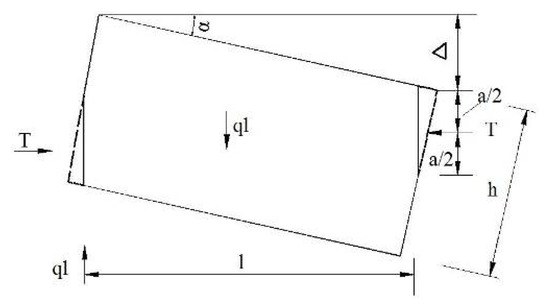 Owing to the articulated point being in a plastic state, the point of action of force T was taken at a/2. The value of Δ can be approximated as lsinα, as follows: