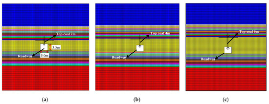 Numerical model with different top coal thicknesses. (a) Top 2 m of coal; (b) Top 4 m of coal; (c) Top 6 m of coal.