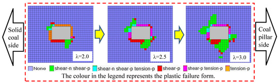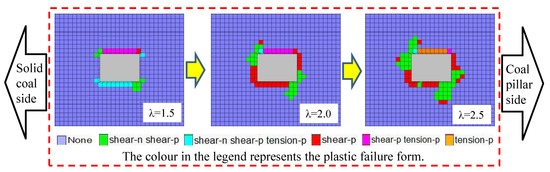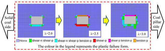 The plastic zone of the rock surrounding the roadway exhibited non-uniform expansion as the absolute value of the principal stress and the principal stress ratio increased. When the top coal was 2 m, the simulation result of the roadway’s plastic zone distribution under different stress environments is shown in Figure 10. When the principal stress ratio was 1.5, the plastic failure of the rock surrounding the roadway mainly occurred at the top and bottom of the roadway. The maximum damage range was located on the side of the coal pillar and the damage depth was 1.0 m. When the principal stress ratio was 2.0, the plastic failure began to expand to the solid coal side and coal pillar side of the roadway. The surrounding rock had asymmetrical damage. The maximum damage range of the surrounding rock was also located at the coal pillar side, and the damage depth was 2.0 m. When the principal stress ratio was 2.5, the plastic failure range significantly increased. Particularly in the roadway floor area, the asymmetric characteristics of the plastic failure distribution were more significant, and the maximum damage depth was 2.5 m.