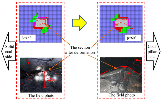 When the principal stress ratio was 3.0 and the principal stress direction was rotated by 45°, the maximum damage depth was 3.5 m and occurred close to the side of the coal pillar. This corresponded to the statistical results of the floor heave deformation of the mining roadway, as shown in Figure 4. The plastic failure depth of the surrounding rock and the floor heave deformation were the largest. Figure 12 shows the comparison of field photos of the mining roadway, and the numerical simulation results of the surrounding rock deformation profile.