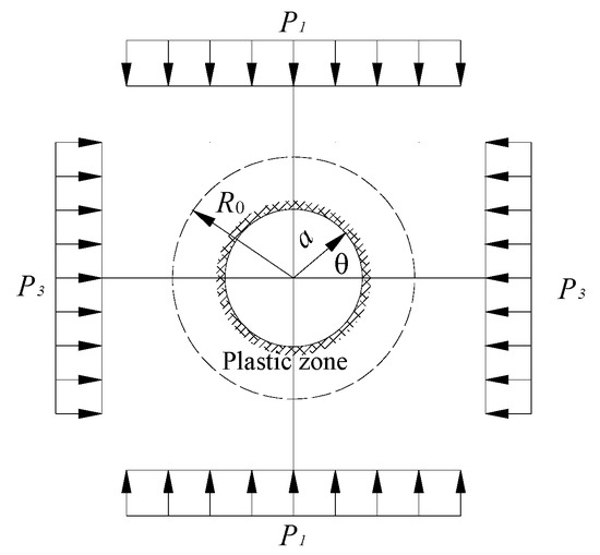 The variation of the principal stress ratio and the rotation angle around the roadway causes the difference in the distribution of the floor heave’s deepest position. The variation of the principal stress ratio determines the plastic failure depth of surrounding rock. The variation of the principal stress rotation angle determines the deflection direction of the plastic zone of the surrounding rock. This phenomenon was theoretically verified. According to the existing results, the circular hole plane strain mechanical model was adopted as shown in Figure 14. Under the condition of homogeneous surrounding rock, the mathematical expression of the plastic zone boundary R0 for the rock surrounding the non-constant pressure circular roadway is expressed as follows [30]: