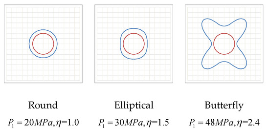 The boundary distribution of the plastic zone can be obtained from Equation (11) under different confining pressure conditions for the rock surrounding the roadway. Thus, it is found that the bidirectional principal stress ratio of the regional stress field controls the shape of the plastic zone of the rock surrounding the roadway. When the regional stress field is bi-directionally isobaric (η = 1), the plastic zone of the rock surrounding the roadway is circular. When the ratio of the bidirectional principal stress is not large (1 < η < K1), the plastic zone of the surrounding rock of the roadway expands in the direction of principal stress, and the plastic zone gradually evolves from a circular shape to an elliptical shape. When the ratio of the bidirectional principal stress is large (η > K1), the plastic zone in the direction of the angle bisector of the angle of the two principal stresses is significantly expanded. The boundary of the plastic zone bulges in the direction of the angle bisector of the angle of the two principal stresses. The plastic zone boundary is sunken in the direction of the principal stress. The plastic zone of the rock surrounding the roadway is butterfly-shaped. The butterfly-shaped plastic zone has four symmetrical butterfly leaves, and marks the deepest position of plastic damage, as shown in Figure 15.