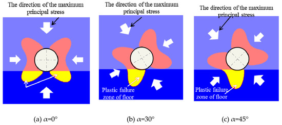 The visualization software used Equation (11) to draw the plastic shape map of the surrounding rock, as shown in Figure 16. Thus, it was found that the plastic zone of the rock surrounding the roadway had a butterfly shape when the bidirectional principal stress ratio was large. Moreover, the butterfly leaves were located near the angle bisector of the angle between the two principal stress directions. In other words, the position of the butterfly leaf in the butterfly plastic zone was directional. As the direction of the maximum principal stress changed, the position of the butterfly blade in the plastic butterfly zone also changed, as shown in Figure 17. Under the conditions of the surrounding rock in the weak floor, when the direction of principal stress was not horizontal or vertical, the position of the butterfly in the butterfly plastic zone was located in the floor of the roadway. At this time, the floor damage depth was the largest, and a strong roadway floor heave phenomenon was observed.