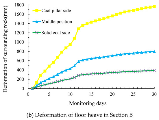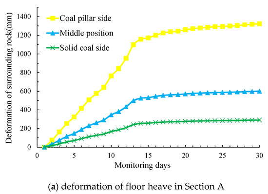 The monitoring results presented in Figure 19 reveal that the asymmetry of the floor heaves was still significant. The Y axis represents the floor depth that plastic failure can achieve. The solid coal side means that the side coal seam will be mined in the future. The middle position means the middle position of the roadway. The coal pillar side means that the side coal seam will be left unmined to ensure safe coal production. The deformation of the floor heave of the mining roadway was approximately stable after 9–12 days. The deformation of the roadway was reduced by 20–40% before being adjusted. Therefore, when the mining and tunneling replacement time is adjusted, the tunneling of the mining roadway should be carried out after the roof activity of the upper section goaf stabilizes.