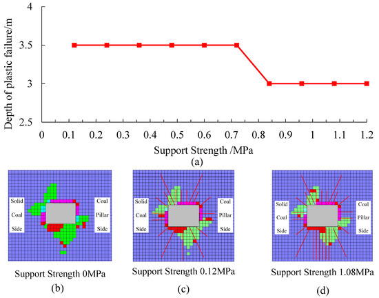 The difference in the thickness of the floor’s hardened layer largely reflected the different support strengths. To visually reflect the effect of the support strength on the failure control of the floor, the number of anchor cables used per roadway floor was represented by different support strengths. As shown in Figure 20, the support strength increased from 0.12 MPa to 1.20 MPa (10 ×Φ21.6 mm anchor cables/m), and the deformation of the surrounding rock was only reduced by 15%. The degree of reduction in the deformation of the surrounding rock is negligible in practical engineering. Based on the above considerations, it can be seen that under the existing engineering conditions, it was difficult to effectively control the plastic failure of the roadway floor by increasing the support strength.