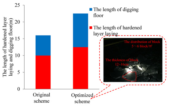 The length of the hardened layer and floor digging within 8 h are shown in Figure 21. Statistical results mainly reflect the efficiency of the work after changing the scheme. The workload of the digging floor and hardened layer laying was greatly improved in 8 h. The optimized floor heave treatment scheme reduced the concrete usage by 50% compared with the non-optimized scheme, and the laying time was reduced by 20%. For the floor, the broken rock mass and hard soil layer were reduced by approximately 40%. Thus, the efficiency of the floor treatment was greatly improved. Overall, the optimized scheme was 40% more efficient than the original non-optimized scheme.