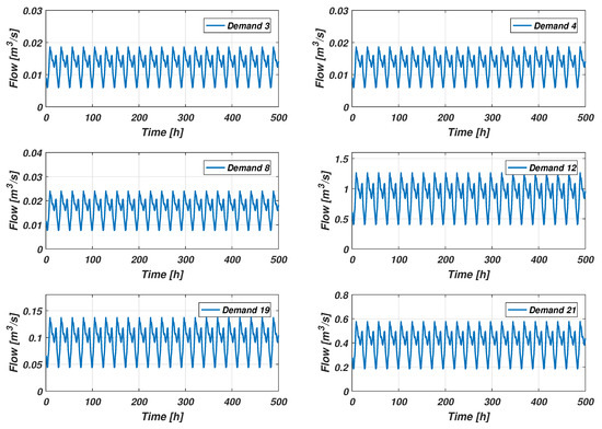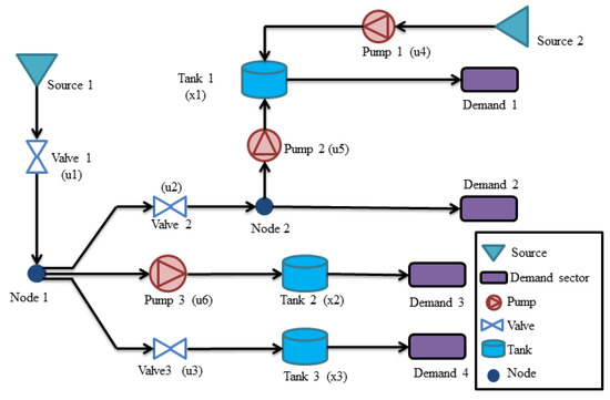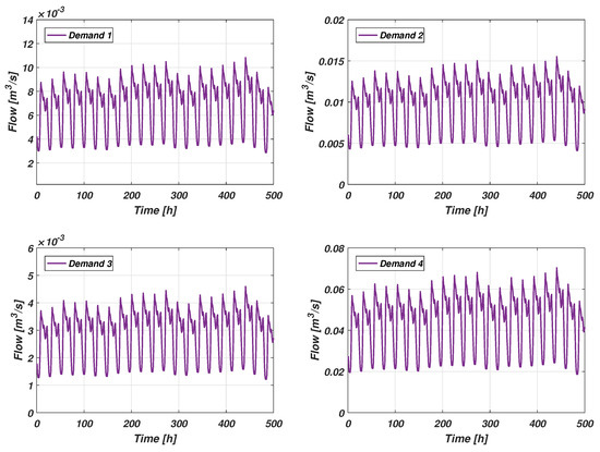In the first example, the proposed study concentrates on a small network based on the Barcelona DWN. Two sources of water and four demand sectors, which represent the district metered area (DMA), are considered (see Figure 2). It is expected that the demand forecast () at each demand sector is known and that every single source can provide this water demand (Figure 3). First, system components must be identified. In this case, there are three pumps, three valves, two sources, three tanks, two intersection nodes, and several pipes.