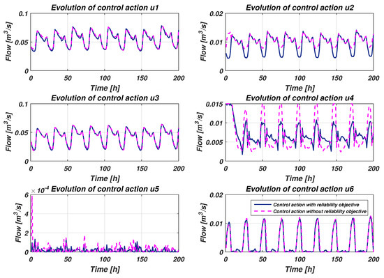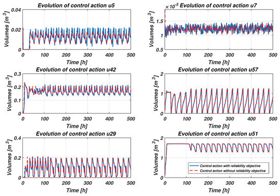 Figure 10 shows the comparative evolution of the valves and pumps commands obtained using the new approach with the case without the reliability-aware objective. Note that the plot of control actions 5, 7, 42, and 29 correspond to pump set-points while control actions 51 and 52 correspond to valve set-points (see Figure 7). The behavior of pumps and valves in both scenarios are almost the same even by including the reliability objective inside the cost function of the controller. Figure 11 presents the comparison of volume evolutions of selected storage tanks. Figure 11 shows the proper replenishment planning that the predictive controller dictates according to the cyclic behavior of demands. Notice that the net demand of each tank is properly satisfied along the simulation horizon. The system reliability evolution of the DWN that was obtained from the proposed controller with and without the reliability-aware objective is presented in Figure 12. According to these results, it can be observed that, with the use of reliability-aware objective in the MPC, the reliability of the network is better preserved compared to the case that the reliability is not considered in the MPC design. There is a trade-off between the increasing system reliability and operational cost. However, the operational cost obtained with new proposed approach is almost the same as the EMPC controller that not considers reliability. This figure also shows that the system reliability is improved about in the case of the LPV-MPC controller with the reliability objective while keeping the performance and the cost is increased just . To have better compare the economics of LPV-MPC with and without the reliability-aware objective, several simulations with different tunings were implemented. Finally, the trade-off curves between the system reliability and economic operational cost for both control schemes are presented in Figure 13. This figure shows that independently of the tuning the economic reliability-aware LPV-MPC control is able to improve and increase the system reliability. The results obtained from the preliminary analysis of Figure 13 are provided in Table 6 and Table 7. The results, as shown in these tables, indicate that the system reliability is improved in different tunings while the cost is increased. However, the increased percentage of operational cost is negligible compared to the improvement of reliability obtained.