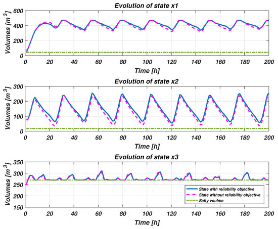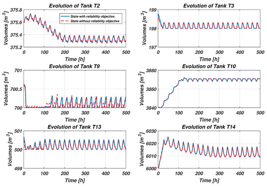 Figure 4 shows the evolution of the valves and pumps commands that were obtained using the new approach of the health-aware LPV-MPC in the three tanks example with and without the reliability-aware objective. As can be seen in Figure 4, the behavior of valve control actions are different from the ones corresponding to the pumps. However, in all of them, the behaviors of control actions in both scenarios are almost the same, thus the reliability-aware objective is not significantly affecting the behavior of the valves and pumps. The comparison of the volume evolution of three tanks based on the health-aware LPV-MPC with and without the reliability-aware objective is presented in Figure 5. The safety volume of each tank is satisfied and hence able to cope with unexpected demands. The system reliability prediction of the DWN, which was obtained when using the proposed controller with and without the reliability-aware objective, is presented in Figure 6. According to these results, it can be observed that, with the use of reliability-aware objective in the MPC, the network reliability is better preserved compared to the case that the reliability is not considered in the MPC objectives. However, the responses of water tanks are similar in both scenarios. The trade-off between the decreasing operating cost and increasing system reliability can be observed in Figure 6. Note that the differences in the amount of the operational cost using the proposed approach is similar to the EMPC controller without reliability objective. Figure 6 shows that the system reliability is increased from to and that is about of improvement, while the accumulated cost is increased from to that is about of increment.