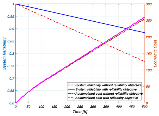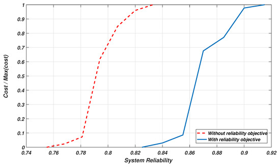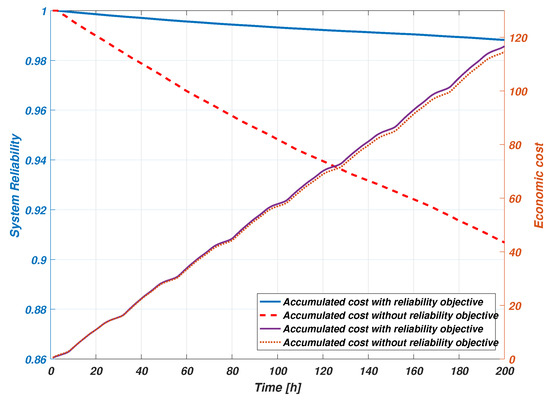 By using Equation (26) and augmented block diagonal weighting matrices and , the cost function in Equation (8) with new additional objective that aims to maximize the system reliability can be rewritten in vector form as