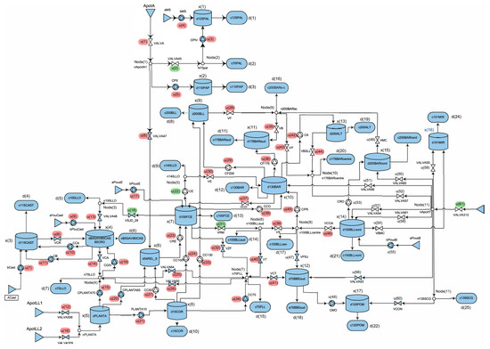Now, a more complex and realistic example also based on the Barcelona DWN is considered as a case study. This case includes 17 tanks and nine sources, consisting of five underground and four surface sources, which currently provide an inflow of about 2 m/s. The case study also includes 61 actuators (valves and pumps), 12 nodes and 25 demands. Figure 7 presents the general topology of the network, showing a complex system in terms of its elements and the relationships and connections between them. Figure 8 presents the graph obtained from this network; the nodes correspond to reservoirs or pipe merging/splitting nodes and the arcs correspond to actuators (pumps and valves). The graph of the water network was obtained from the state space representation of the system. This approach is explained with more detail in [36].