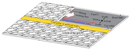 With the development of clean utilization technologies, coal will always provide energy sources for the social development [1]. To ensure the efficient operation of coal production systems, security maintenance of entries in underground mining is extremely important, including large deformation control, rock burst forecast, and other early warnings of dynamic disaster [2,3,4]. As the development of the longwall mining, many entries are arranged along the side of a gob with a protection of coal pillar or artificial wall, so as to cope with the mining-induced movement of the hard roof structures [5,6,7]. Figure 1 schematically describes entry conditions when extracting coal from Panel 2. Tail entry provides auxiliary transportation and ventilation function for Panel 2. A coal pillar or artificial wall is built in the south of tail entry; and the coal mass of Panel 2 is located in the north of Tail entry. Gob 1 is located near the coal pillar. The spontaneous caving method was used to handle the roofs in Gob 1 [8]. To effectively control the deformation of tail entry in the strong mining pressure zone, it is important to understand the mechanical behavior of the hard roof structures above the side of Gob 1 during retreat of the mining working face of Panel 2.