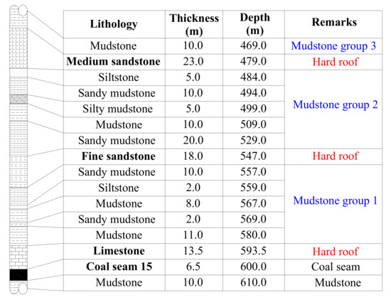 Entry conditions in the underground mining. The tail entry is located in the coal-seam 15 of the First Yangquan coal mine in the city of Yangquan, Shanxi Province, China. Panel 2 is approximately 2200 m long by 220 m wide. The average thickness and buried depth of coal-seam 15 are 6.5 m, 600 m, with the dip angle of 4°. As shown in Figure 2, the rock strata above coal-seam 15 are limestone, mudstone group, and fine sandstone, whereas below coal-seam 15 are mudstone and sandstone. The tail entry with dimensions of 5.0 m × 4.0 m is arranged along the immediate roof. The width of the coal pillar is 15 m.