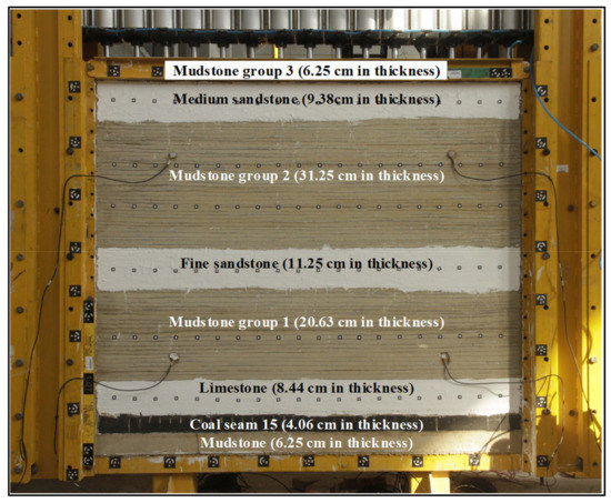 Eight materials with different deformability and strength were used to simulate the mechanical behavior of geological strata, including mudstone, coal seam 15, limestone, mudstone group 1, fine sandstone, mudstone group 2, medium sandstone, and mudstone group 3. Materials were mingled with sand, gypsum, water, calcium carbonate, and mica powder. Under the condition of the uniaxial compression test and the strength similarity ratio, the ratio of the material contents was determined based on the existing results [49]. In this work, there were eight materials, as shows in Table 1 and Table 2. In total, 1733.91 kg sand, 169.10 kg calcium carbonate, 234.49 kg gypsum, and 25 kg mica powder were used in this model.
