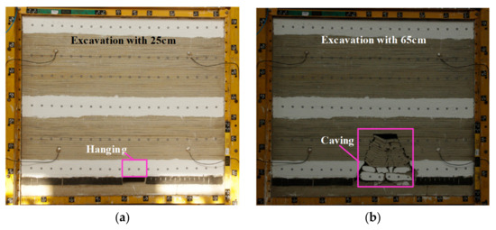 Eight physical geological layers were modeled and compacted one by one, and every geological layer was separated with certain mica powder. After two months of the model completion, the longwall face was retreated successively from the panel center to panel boundary to simulate the mechanical behavior of hard roofs. In each stage, 50 mm long coal was excavated by using a mini shovel after 5 min. Then, the next excavation was conducted after 20 min. A universal camera was used to directly observe and record the physical configuration and loading conditions of hard roof structures. The typical results are shown in Figure 4 and Figure 5. The detailed characteristics of IHRS are described in Section 2.2.