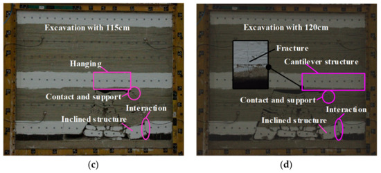 Generating process of interactional hard roof structures (IHRS). Excavation length of 25 cm (a), 65 cm (b), 115 cm (c), and 120 cm (d).