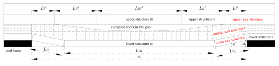 IHRS, consisting of a lower key structure, middle soft interlayer, and upper key structure, are governed by the mechanical behavior of the lower and upper key structures, as shown in Figure 6. The lower key structure, loaded by the middle soft interlayer, is stable with the supports of the lower structure I, the lower structure III, and the gob floor. The middle soft interlayer, supporting the upper key structure partly and loading the lower key structure entirely, is the transfer medium of the force between the upper and lower key structures. The upper key structure, loaded by the overlying strata, is stable with the supports of the upper structure II, the middle soft interlayer, and the compaction rock mass. The interactional upper structure II and upper structure III, loaded by the overlying strata, are stable with the supports of the upper key structure.