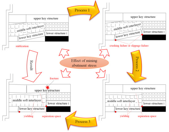 The mining-induced failure criteria for IHRS can be divided into three processes, as shown in Figure 7. In Process 1, the gradual increase of additional abutment stress, which belongs to IHRS boundary condition, is the main external factor for the failure of IHRS. In process 2, the yielding at the lower key structure where crushing failure or slippage failure occurs on the contact surface is the main internal factor of IHRS failure. The fracture of the upper key structure, induced by the shear failure or tensile failure of the rock materials, is another internal factor for the failure of IHRS in Process 3. The crushing failure or slippage failure of the contact face is the result of Process 1 and the cause of Process 2. Similarly, the vanishing of the action force between the upper and lower key structures is the result of Process 2 and the cause of Process 3.
