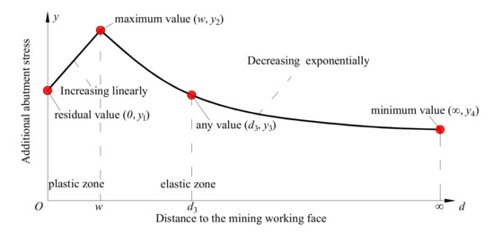 The additional abutment stress, which is generated from overlying loads above the gob, has a loading effect on the rock around the gob [50]. With the distance from the working face to the location of minimum additional abutment stress, the additional abutment stress increases gradually. Then, it decreases gradually as the distance to the mining working face decreases from the beginning of the maximum value, as shown in Figure 8 [5]. There are four feature points on the curve of the additional abutment stress, including the points of the residual value (0, y1), the maximum value (w, y2), the any value (d3, y3), and the minimum value (∞, y4).
