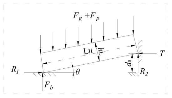 In Figure 9, Fg is the weight of the middle soft interlayer and the lower key structure, kN. Fg can be calculated by Equation (4). Fp is the the loading transferred from the upper key structure, kN; R1 is the horizontal friction force between the lower key structure and the gob floor, kN; Fb is the vertical support force of the gob floor, kN; R2 is the vertical friction force between the lower key structure and the lower structure I, kN; T is the horizontal support force of the lower structure I, kN; hL is the thickness of the lower key structure, m.