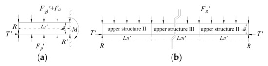 In Figure 10, FgI′ is the weight of the upper soft interlayer and the upper key structure, and it can be calculated by Equation (11), kN; Fg′ is the weight of the upper soft interlayer, the upper structure II, and the upper structure III, and it can be calculated by Equation (12), kN; R is the friction force between the upper key structure and the upper structure II, kN; R′ is the shear force between the upper key structure and the upper compaction strata, kN; T′ is the horizontal crushing force of the upper structures, kN; M is the force moment of upper key structure, kN∙m. FP′ is the support force of upper key structure by the middle soft interlayer which is the reaction of FP, kN; hu is the thickness of the upper key structure, m.