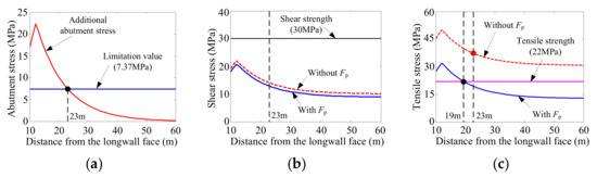 As shown in Figure 11a, when the additional abutment stress reaches 7.37 MPa at 23 m away from the longwall working face, yielding of the lower key structure and middle soft interlayer are induced. At the same time, as the force between the upper key structure and the lower key structure vanishes instantaneously, the shear stress is less than the shear strength, and the tensile stress is greater than the tensile strength of the upper key structure, as shown in Figure 11b,c. The fracture of upper key structure occurs due to the tensile failure.