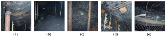 Deformation of the underground openings nearby IHRS. (a) Roof sink; (b) floor heave; (c) rib displacement; (d) support failure; (e) roof caving.
